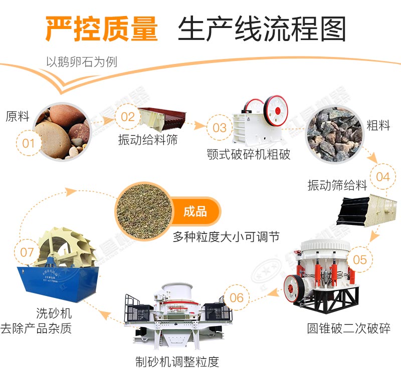 天然原石經(jīng)振動(dòng)給料機(jī)送入顎式破碎機(jī)內(nèi)進(jìn)行初步的破碎,經(jīng)過(guò)振動(dòng)篩篩選,合格部分繼續(xù)送入細(xì)碎機(jī)進(jìn)行打沙加工,對(duì)于粒度要求嚴(yán)格的生產(chǎn)線(xiàn),可以接入振動(dòng)篩,多重篩分能夠進(jìn)一步優(yōu)化成料品味,細(xì)化分級(jí),成品砂料品味更好,級(jí)配更合理。